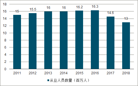 而從業人員總量由2005年的1100萬人增加到2016年的1630萬人;2017年,行業從業人員數量開始下降,截至2018年底,全行業就業人口達1300萬人以上。