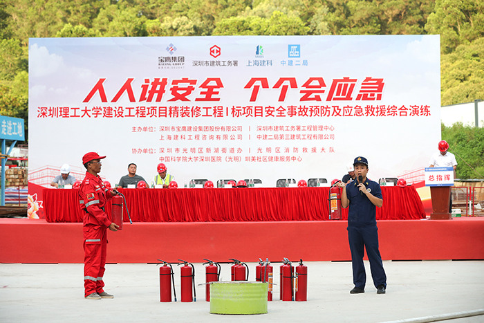 6月21日,由深圳市寶鷹建設集團股份有限公司、深圳市建筑工務署工程管理中心、上海建科工程咨詢有限公司、中建二局第三建筑工程有限公司聯(lián)合主辦,深圳市光明區(qū)新湖街道辦、光明區(qū)消防救援大隊、中國科學院大學深圳醫(yī)院(光明)圳美社區(qū)健康服務中心協(xié)辦的2023年安全生產(chǎn)月”安全事故預防及應急救援綜合演練在深圳理工大學建設工程項目舉行