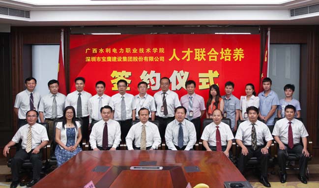 2012年7月8日,深圳市寶鷹建設集團股份有限公司(下簡稱“寶鷹集團”)與 廣西 水利電力職業技術學院(下簡稱“廣西水電學院”)人才聯合培養簽約儀式暨人才聯合培養基地揭牌儀式在寶鷹集團總部隆重舉行。廣西水電學院院長、教授、高級工程師劉延明,副院長、博士生導師、教授黃偉軍等及寶鷹集團常務副總裁許平、董事長助理古德、副總裁古樸等領導出席了儀式。