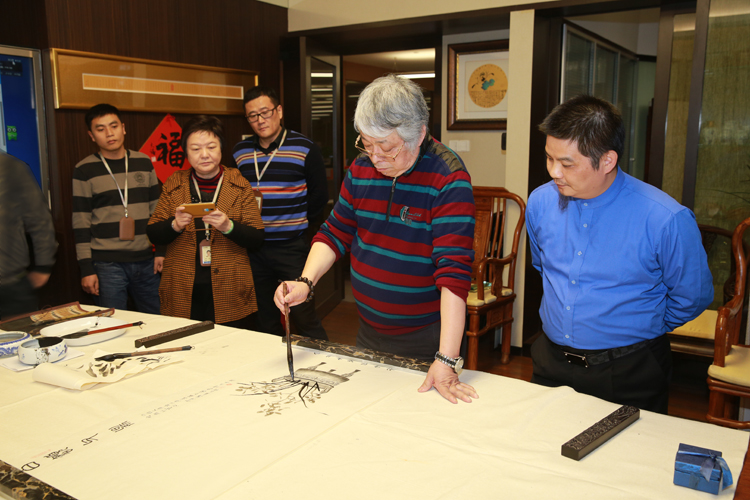 周國(guó)城主席揮毫寫蘭花(一)(右一為東莞旗峰山藝術(shù)館館長(zhǎng)王躍慶先生,左一為寶鷹集團(tuán)監(jiān)事會(huì)主席胡蘭萍女士,右二為寶鷹集團(tuán)副總裁古樸先生)
